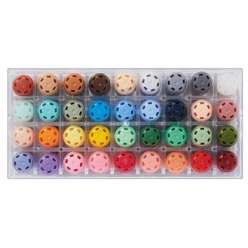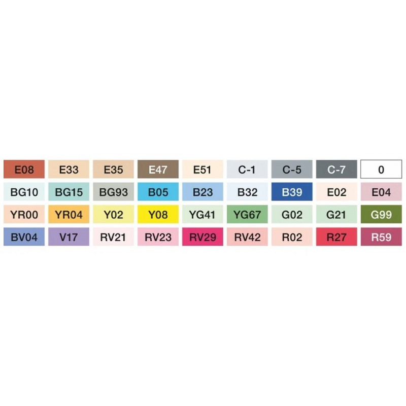 В состав набора входит: E08, BG10, YR00, BV04, E33, BG15, YR04, V17, E35, BG93, Y02, RV21, E47, B05, Y08, RV23, E51, B23, YG41, RV29, B32, YG67, RV42, B39, G02, R02, E02, G21, R27, E04, G99, R59, C-1, C-5, C-7, 0 (бесцветный блендер).
