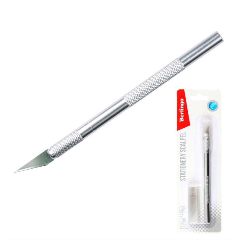 Нож-скальпель предназначен для работы по бумаге. Алюминиевый корпус имеет ребристость в зоне захвата, препятствуя скольжению пальцев. Нож-скальпель оснащен колпачком для безопасного хранения и транспортировки. В комплекте 5 запасных лезвий в пластиковом пенале.