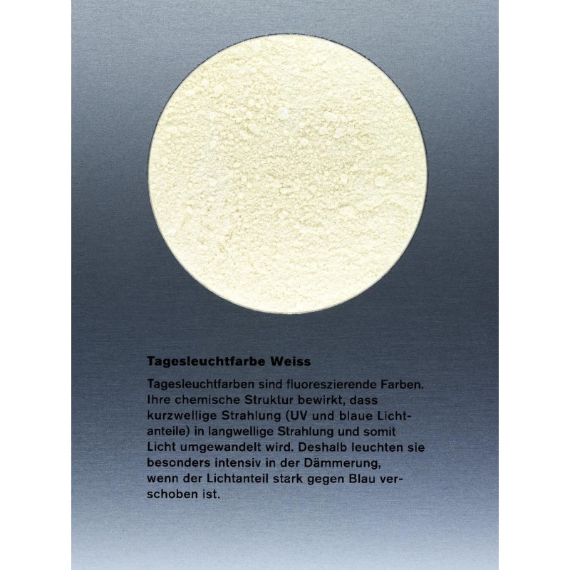 Флуоресцентные краски – это особенно яркие пигменты, которые обладают ярким эффектом даже при обычном дневном свете и могут флуоресцировать под действием УФ-излучения. Благодаря низкой укрывистости, их выгодно наносить на белый фон. Добавление небольшого количества флуоресцентной краски дневного света к другим пигментам увеличивает яркость днем и при освещении УФ-излучением. Благодаря умеренной светостойкости и медленному высыханию эти пигменты редко используются в масляных красках. Хотя флуоресцентные краски дневного света трудно диспергировать в водных связующих, их предпочтительно использовать в акварели или акриле. Низкую светостойкость этих пигментов невозможно улучшить даже с помощью УФ-защитного лака. Если вы хотите использовать флуоресценцию этих пигментов, убедитесь, что связующее не содержит УФ-поглотителя.