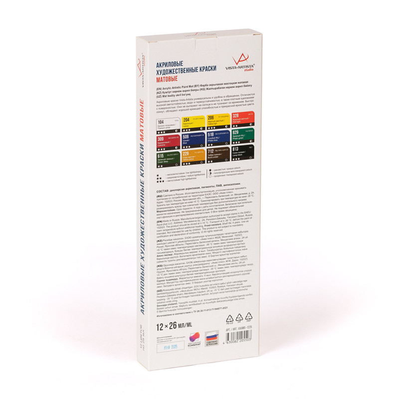 Художественные акриловые краски Vista-Artista Studio универсальны и удобны в обращении. Отличаются высокой светостойкостью, водо- и термоустойчивостью, а также плотным сцеплением с поверхостью. Быстро сохнут, обладают хорошей покрывной способностью и прекрасной яркостью цвета. Акриловую краску можно использовать для внешних работ.