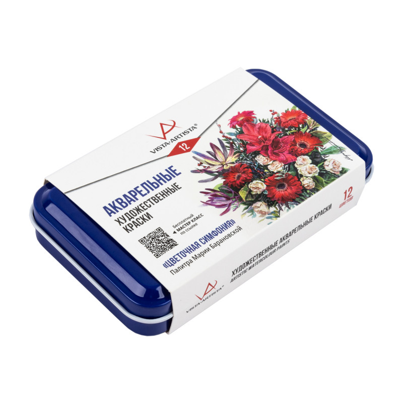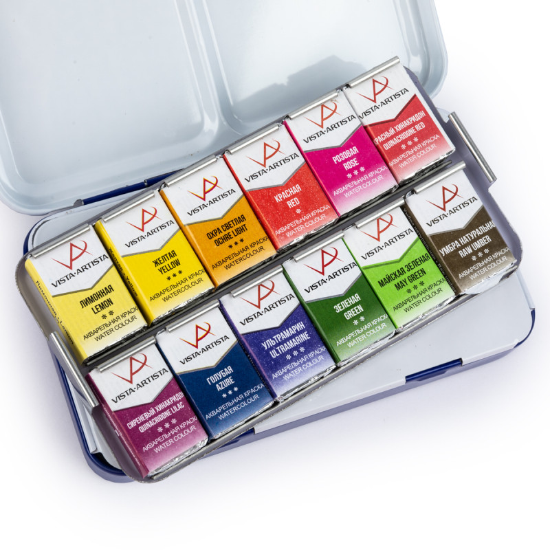 Художественные акварельные краски Vista-Artista – это профессиональная высокопигментированная акварель в кюветах на основе натурального гуммиарабика и тонкодисперсных пигментов. Благодаря натуральному связующему краски легко набираются на кисть, прекрасно размываются и разносятся по бумаге. Тонкий помол пигмента обеспечивает прозрачность и яркость красочного слоя. Каждый цвет произведен по уникальной рецептуре, основанной на традициях Петербургской школы живописи.