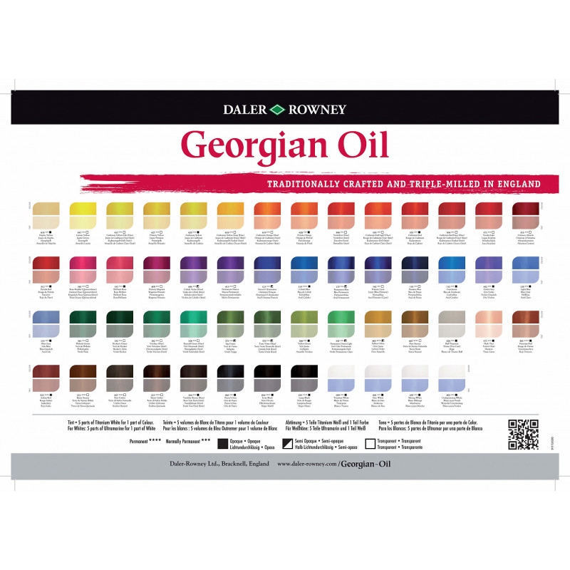 Высококачественные английские масляные краски Daler Rowney Georgian. При изготовлении масляных красок пигменты тщательно перетираются так, что сохраняется качество и текстура краски в каждой новой партии, при этом достигается максимально возможная яркость и насыщенность цвета. Краски Georgian хорошо ложатся, дают чёткую структуру мазка, отлично смешиваются между собой и обладают высоким содержанием пигментов.