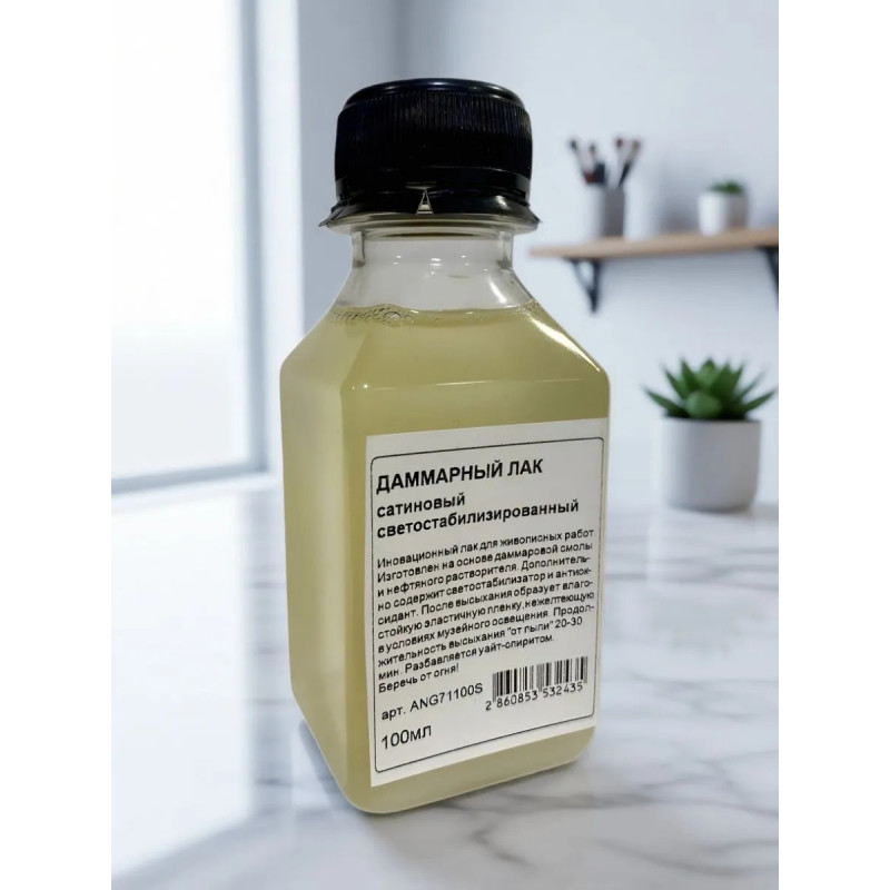 Даммарный лак Черная речка светостабилизированный – это инновационный лак для живописных работ, не содержащий автоокисляющихся растворителей - скипидара или пинена. Дополнительно содержит: светостабилизатор, пластификатор, антиоксидант и матирующий агент. Отличается от классического - скипидарного даммарного лака тем, что имеет длительный срок хранения в таре, а после высыхания образует эластичную влагостойкую пленку, не желтеющую в условиях музейного освещения.